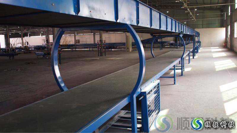 快递分拣线一般由控制装置、分类装置、输送装置及分拣道口组成。 控制装置的作用是识别、接收和处理分拣信号,根据分拣信号的要求指示分类装置、按商品品种、按商品送达地点或按货主的类别对商品进行自动分类。这些分拣需求可以通过不同方式,如可通过条形码扫描、色码扫描、键盘输入、重量检测、语音识别、高度检测及形状识别等方式,输入到分拣控制系统中去,根据对这些分拣信号判断,来决定某一种商品该进入哪一个分拣道口。 分类装置的作用是根据控制装置发出的分拣指示,当具有相同分拣信号的商品经过该装置时,该装置动作,使改变在输送装置上的运行方向进入其它输送机或进入分拣道口。分类装置的种类很多,一般有推出式、浮出式、倾斜式和分支式几种,不同的装置对分拣货物的包装材料、包装重量、包装物底面的平滑程度等有不完全相同的要求。 输送装置的主要组成部分是传送带或输送机,其主要作用是使待分拣商品鱼贯通过控制装置、分类装置,并输送装置的两侧,一般要连接若干分拣道口,使分好类的商品滑下主输送机(或主传送带)以便进行后续作业。 分拣道口是已分拣商品脱离主输送机(或主传送带)进入集货区域的通道,一般由钢带、皮带、滚筒等组成滑道,使商品从主输送装置滑向集货站台,在那里由工作人员将该道口的所有商品集中后或是入库储存,或是组配装车并进行配送作业。